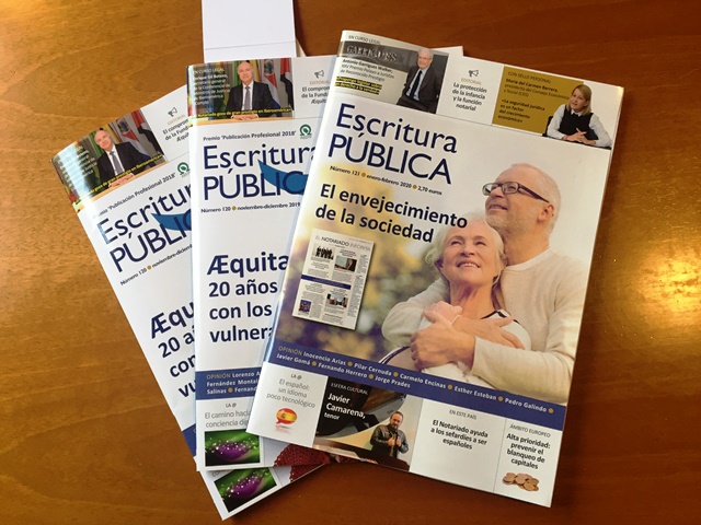 Tras el dedicado a Aequitas, el número 121 de la revista del Consejo General del Notariado, Escritura Pública, abre con un artículo dedicado al envejecimiento en la sociedad. Como es habitual, el Colegio Notarial del País Vasco participa también en este número con noticias sobre las actividades realizadas en la sede del Colegio, así como las de sus colegiados en otros foros nacionales: inicio del curso de la AVD-ZEA, entrega de los premios Adrián Celaya a jóvenes juristas, etcétera
