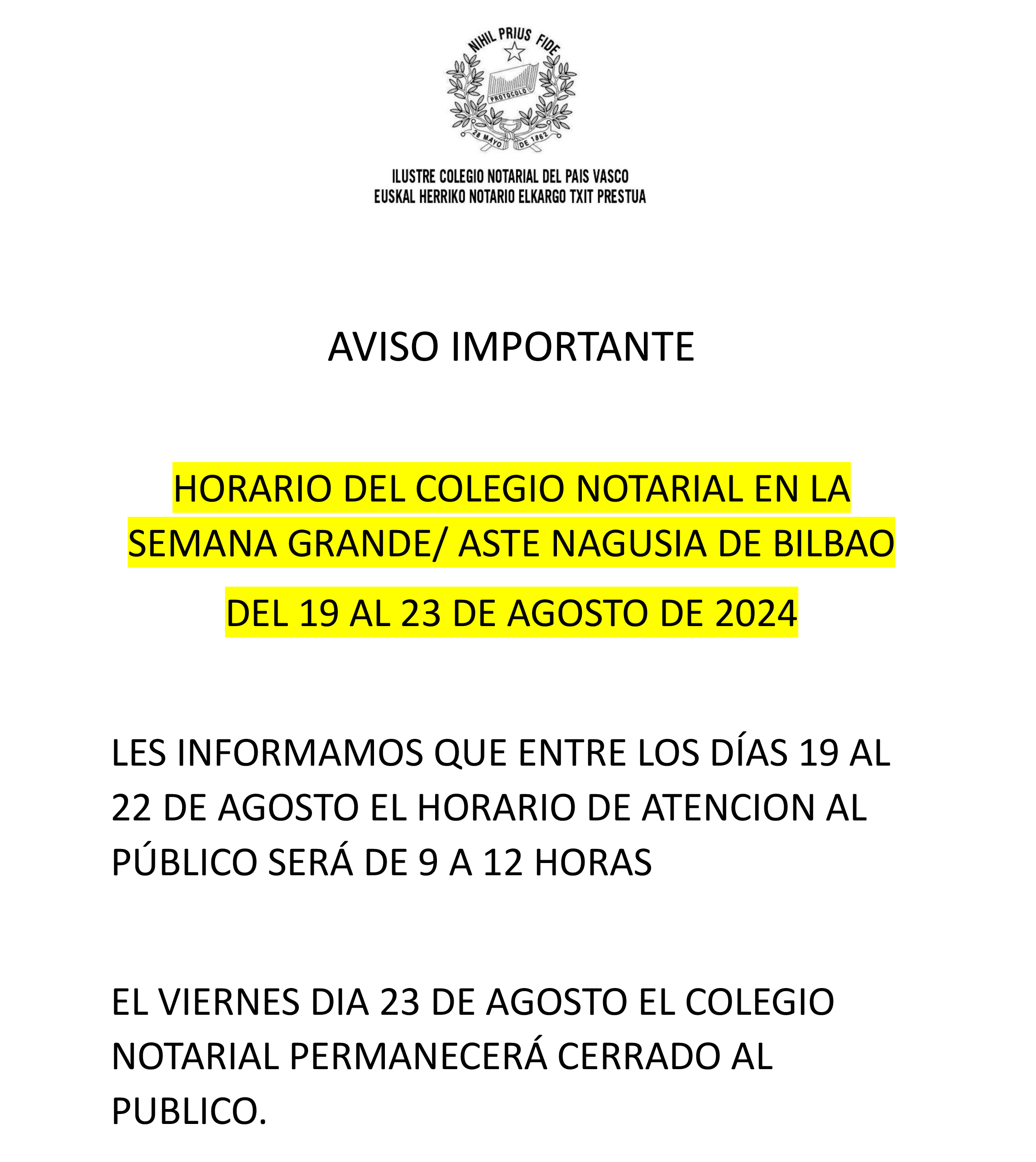 null AVISO IMPORTANTE. Horario del Colegio Notarial en Aste Nagusia