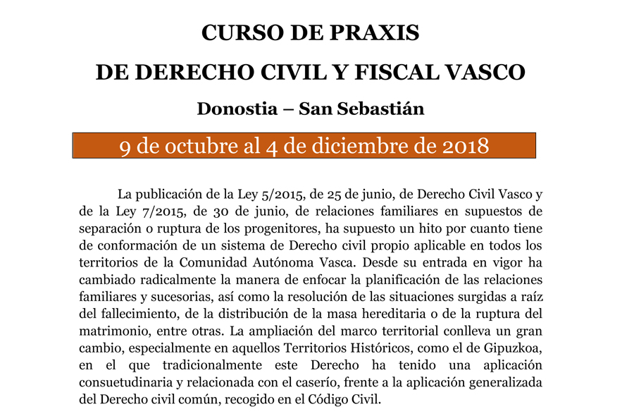 29/11/2018 Avanza el curso de praxis de derecho civil y fiscal vasco... Avanza el curso de praxis de derecho civil y fiscal vasco en San Sebastián